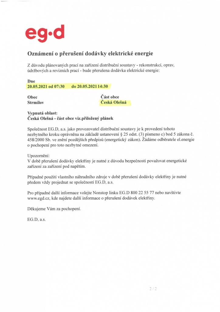 Oznámení o přerušení dodávky elektrické energie - Česká Olešná 20.05.2021 07:30-14:30 hod.